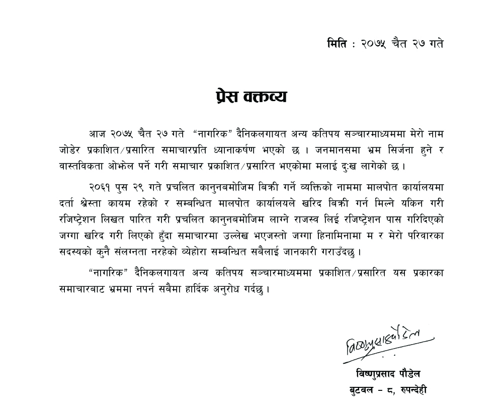 महासचिव पाैडेलको विज्ञप्तिमा भनिएको छ ‘२०६१ पुस २९ गते प्रचलित कानुनबमोजिम बिक्री गर्ने व्यक्तिको नाममा मालपोत कार्यालयमा दर्ता श्रे्रस्ता कायम रहेको र सम्बन्धित मालपोत कार्यालयले खरिद बिक्री गर्न मिल्ने यकिन गरी रजिष्ट्रेशन लिखत पारित गरी प्रचलित कानुनबमोजिम लाग्ने राजस्व लिई रजिष्ट्रेशन पास गरिदिएको जग्गा खरिद गरी लिएको हुँदा समाचारमा उल्लेख भएजस्तो जग्गा हिनामिनामा म र मेरो परिवारका सदस्यको कुनै संलग्नता नरहेको व्येहोरा सम्बन्धित सबैलाई जानकारी गराउँदछु ।’