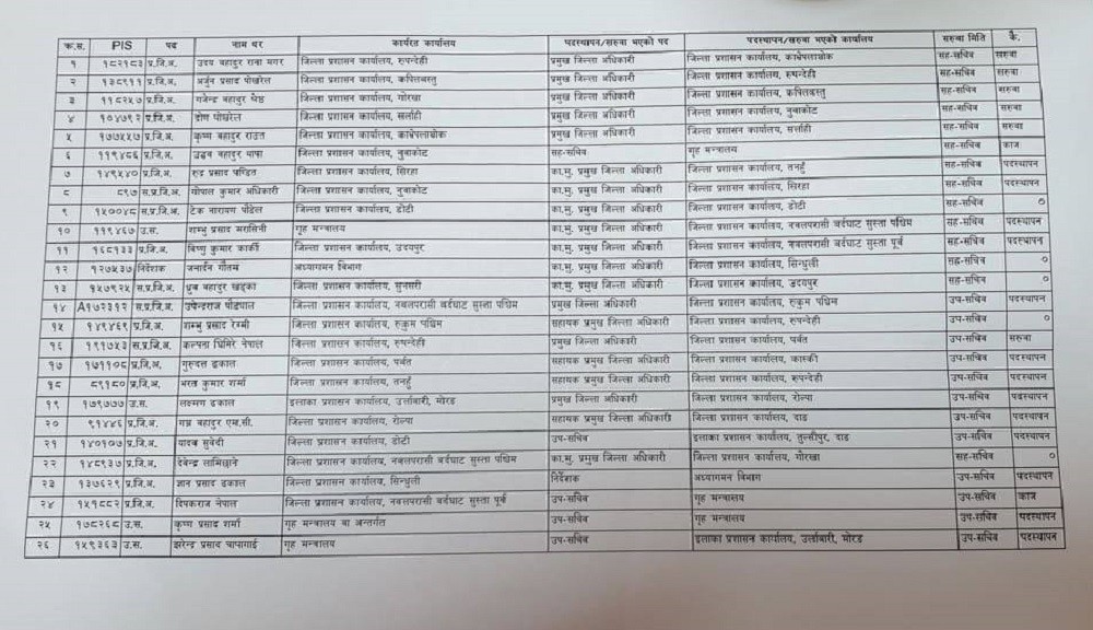 नुवाकोटमा कार्यरत उद्धवबहादुर थापाको गृह मन्त्रालय, नुवाकोटमा द्रोण पोखरेल, सिरहामा कार्यरत रुद्रप्रसाद पण्डितको तनहुँ, गोपालकुमार अधिकारीको सिरहा, डोटीमा टेकनारायण पौडेल, सिन्धुलीमा जनार्दन गौतम, ध्रुवबहादुर खड्का उदयपुर सरुवा भएका छन्।