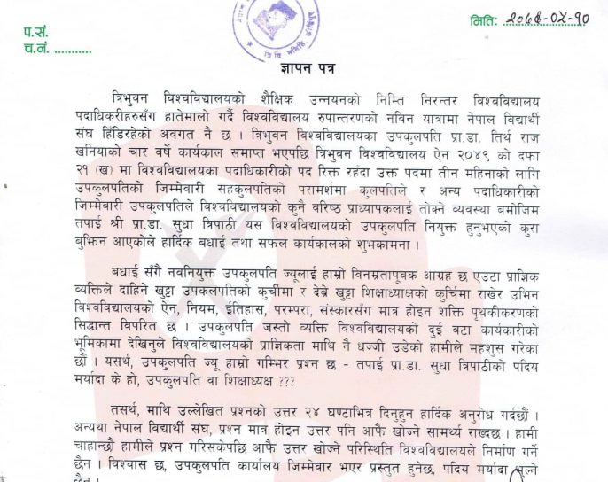 त्रिभुवन विश्वविद्यलयका उपकुलपति तीर्थ खनियाँको चार वर्षीय कार्यकाल सकिएपछि सरकारले रेक्टर त्रिपाठीलाई नै तीन महिनाको लागि उपकुलपति तोकेपछि नेविसंघले दुवै पदमा एक व्यक्ति रहन नमिल्ने भन्दै एक पद छोडन माग गरेको हो ।
