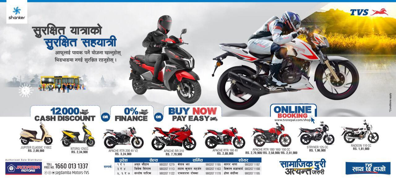 टिभिएस मोटर कम्पनीको नेपाल स्थित आधिकारिक वितरक जगदम्बा मोटर्सले सुरक्षितयात्राको सुरक्षित सहयात्री योजना सार्वजनिक गरेको छ।
