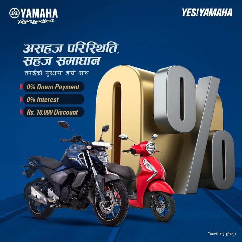नेपालका लागि यामाहाको आधिकारिक विक्रेता एमएडब्लु इन्टरप्राइजेजले मोटरसाइकलतथा स्कुटर खरिदमा शुन्य प्रतिशत फाइनान्स स्किम सुरु गरेको छ। यो स्किम अन्तर्गत ग्राहकले तीन वर्ष अवधिका लागि शुन्य डाउन पेमेन्टमा यामाहाका जुनसुकै मोटरसाइकल र स्कुटर खरिद गर्न सक्नेछन्।