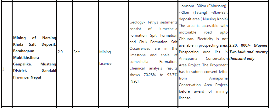 विभागले मुस्ताङको वारागुङ मुक्तिक्षेत्र गाउँपालिकाको नर्सिङखोलामा रहेको नुन खानी उत्खनन्का लागि अनुमतिपत्र दिन लागेको हो । उक्त क्षेत्रको चट्टानमा गरिएको रासायनिक परीक्षणले ७०.२८ प्रतिशतदेखि ९३.७ प्रतिशतसम्म सोडियम क्लोराइड रहेको देखाएको थियो । “रासायनिक परीक्षणले गुणस्तरीय नुन रहेको देखाएपछि उत्खनन्का लागि प्रक्रिया शुरु गरिएको हो”, विभागका प्रवक्ता डा. जनकबहादुर चन्दले बताए।