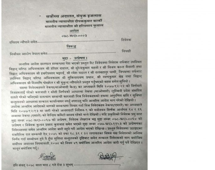 सर्वोच्च अदालतले लुम्बिनी प्रदेशसभाका सदस्यद्वय दधिराम न्यौपाने र दिनेश पन्थीलाई नेकपा माओवादी केन्द्रले गरेको कारवाहीका सम्बन्धमा ‘अन्तरिम आदेश जारी नहुने’ ठहर गरेको छ ।