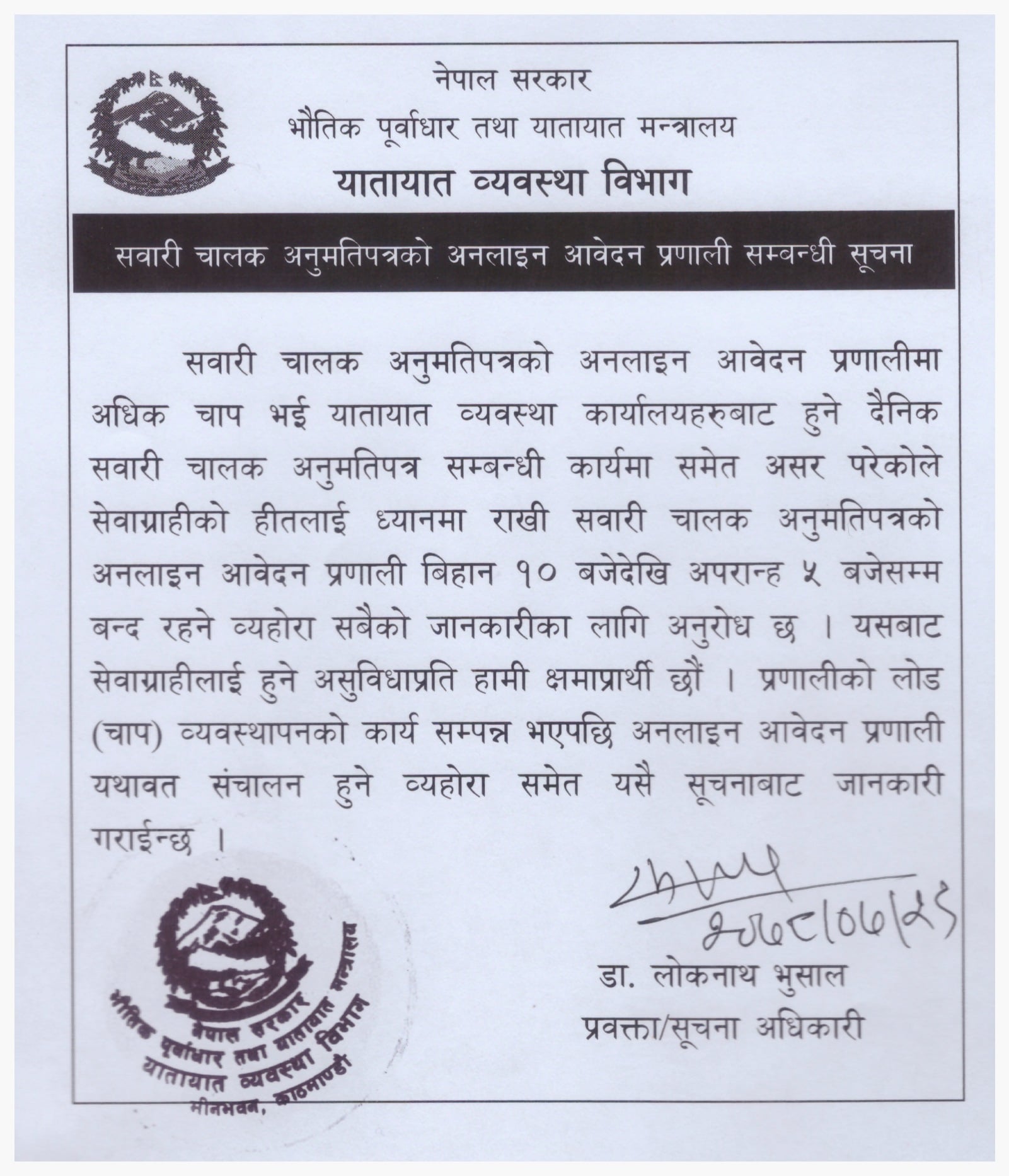 दिउँसोको समयमा आवेदन भर्नेहरु धेरै हुँदा प्रणाली ‘स्लो’ भएर यातायात कार्यालयमा सेवा दिन समस्या भएपछि कार्यालय समयमा अनलाइन आवेदन भर्न नपाइने व्यवस्था गरिएको हो। यातायात व्यवस्था विभागका प्रवक्ता डा. लोकनाथ भुसालले केही दिन कार्यालय समयमा प्रणालीमा अनलाइन आवेदन भर्न नसकिने बताए।