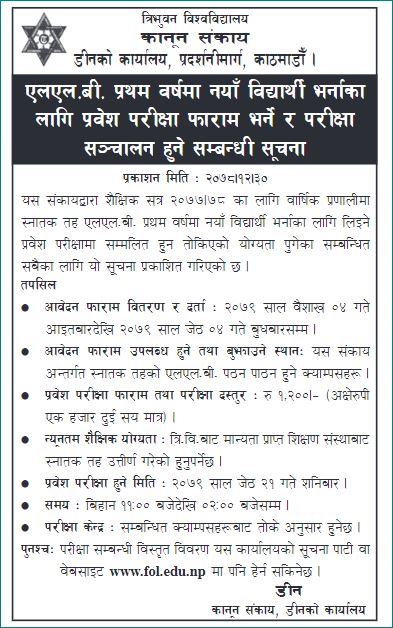 त्रिभुवन विश्वविद्यालय कानून संकायअन्तर्गत डिनको कार्यालयले एलएलबी पहिलो वर्षमा भर्नाका लागि प्रवेश परीक्षा फारम खोलेको छ।