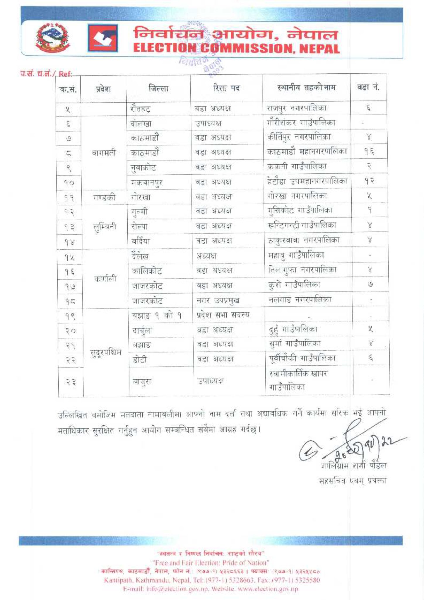मतदाता दर्ता सम्बन्धी विद्यमान व्यवस्था बमोजिम देशभरका योग्यता पुगेका सबै नेपाली नागरिकहरूको मतदाता नामावलीमा नाम दर्ता भएकै छ भन्नेमा आयोग विश्वस्त छ। तथापि, विभिन्न कारणले मतदाता नामावलीमा नाम दर्ता गर्न छुट भएका देशभरका र विशेषतः पद रिक्त भएका देहायका स्थानीय तह, प्रदेश सभा निर्वाचन क्षेत्र र प्रतिनिधि सभा निर्वाचन क्षेत्रभित्रका योग्यता पुगेका नेपाली नागरिकलाई उपनिर्वाचनको मिति घोषणा हुनुपूर्व नै मतदाता नामावलीमा नाम दर्ता गर्न आयोग आह्वान गर्दछ।’