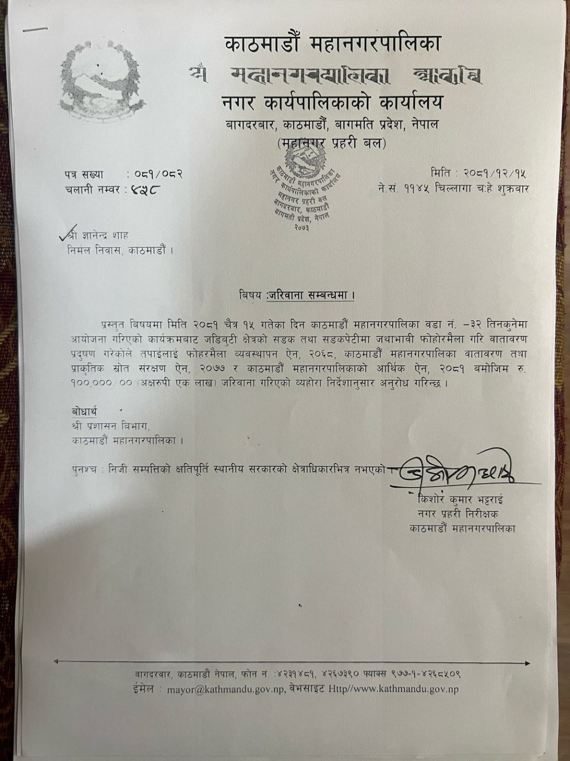 महानगरपालिकाले पूर्वराजा ज्ञानेन्द्र शाहलाई ८ वटा पत्र काटेको छ । पूर्वराजाको सहमतिमा शुक्रबार राजवादीले राजधानीको तीनकुने क्षेत्रमा प्रदर्शन गरेकामा फोहोरमैला गरेको लगायतका कारण देखाउँदै जरिवाना र क्षतिपूर्ति माग गर्दै पत्र काटेको हो ।