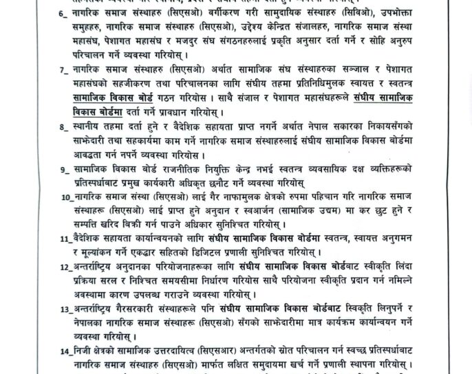 स्वतन्त्र सामाजिक विकास बोर्डको स्थापना संघ संस्थाहरूले संघीय तहमा प्रतिनिधिमूलक, स्वायत्त, र स्वतन्त्र सामाजिक विकास बोर्ड गठन गर्न माग गरेका छन्, जसले संघ संस्थाहरूको दर्ता, नविकरण, अनुगमन, र मूल्यांकनको जिम्मेवारी लिने छ ।