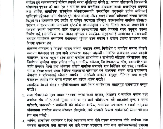 बाजुरा १६ जेठ- नेपालका नागरिक संघ–संस्था तथा सामाजिक संघ–संस्थाहरूले हालको कानुनी तथा नीतिगत संरचनाले उनीहरूको स्वतन्त्रता र कार्य क्षमता सीमित गरेको भन्दै समय सापेक्ष सुधारको माग गर्दै नेपाल सरकारलाई आधार पत्र बुझाएका छन् । नागरिक संघ संस्थाहरूको आधारपत्र २०८२ शीर्षकमा जारी दस्तावेजमा, संघ संस्थाहरूले लोकतान्त्रिक गणतन्त्रको सुदृढीकरणका लागि नागरिक समाज मैत्री कानुनी वातावरण निर्माण गर्न सरकारसँग अपिल गरेका छन् ।