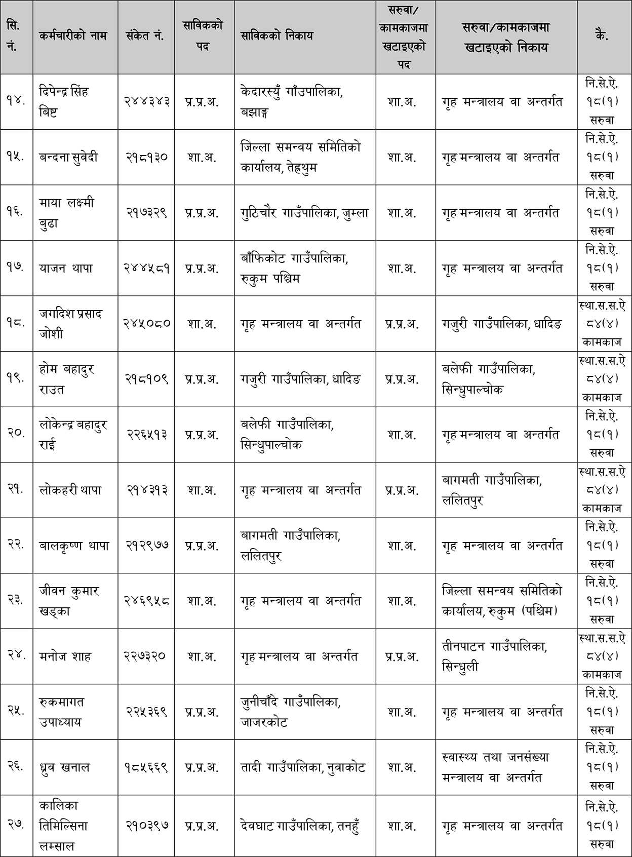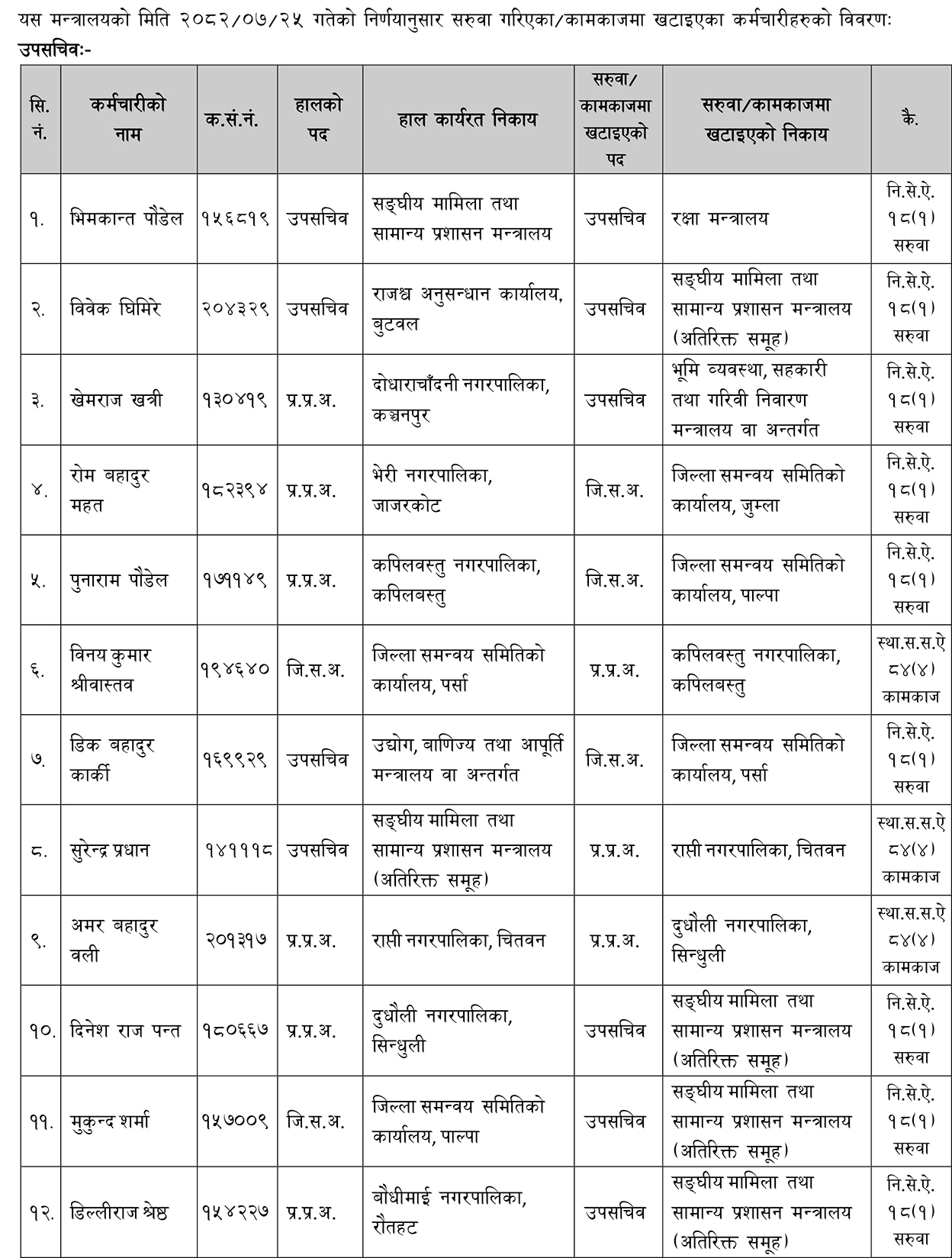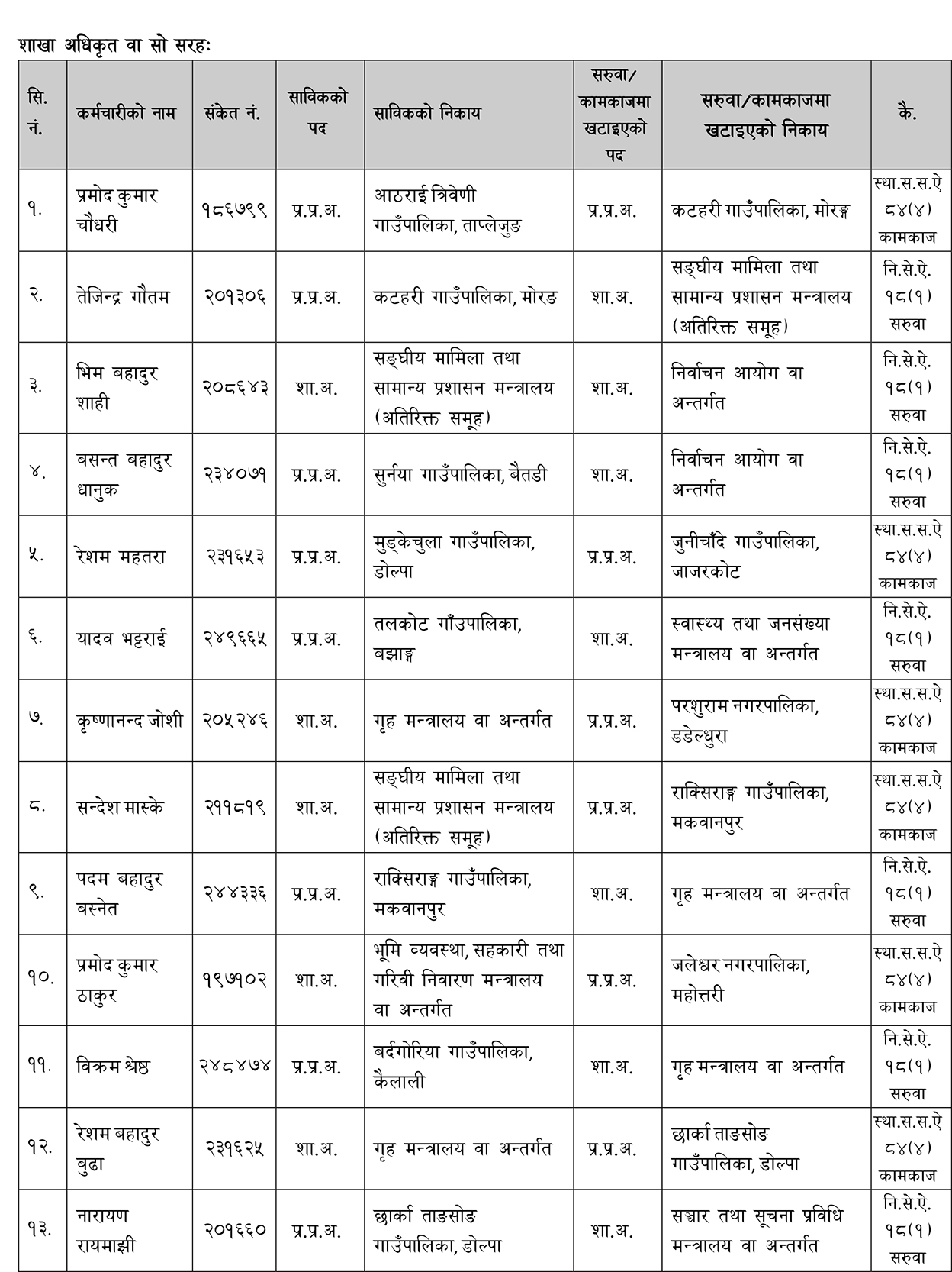 सरकारले १२ उपसचिव र ३१ शाखा अधिकृतसहित ४३ कर्मचारीहरुको सरुवा गरेको छ । संघीय मामिला तथा सामान्य प्रशासन मन्त्रालयले यही कात्तिक २५ गतेको सचिवस्तरीय निर्णयबाट कर्मचारीहरुको सरुवा गरेको हो ।