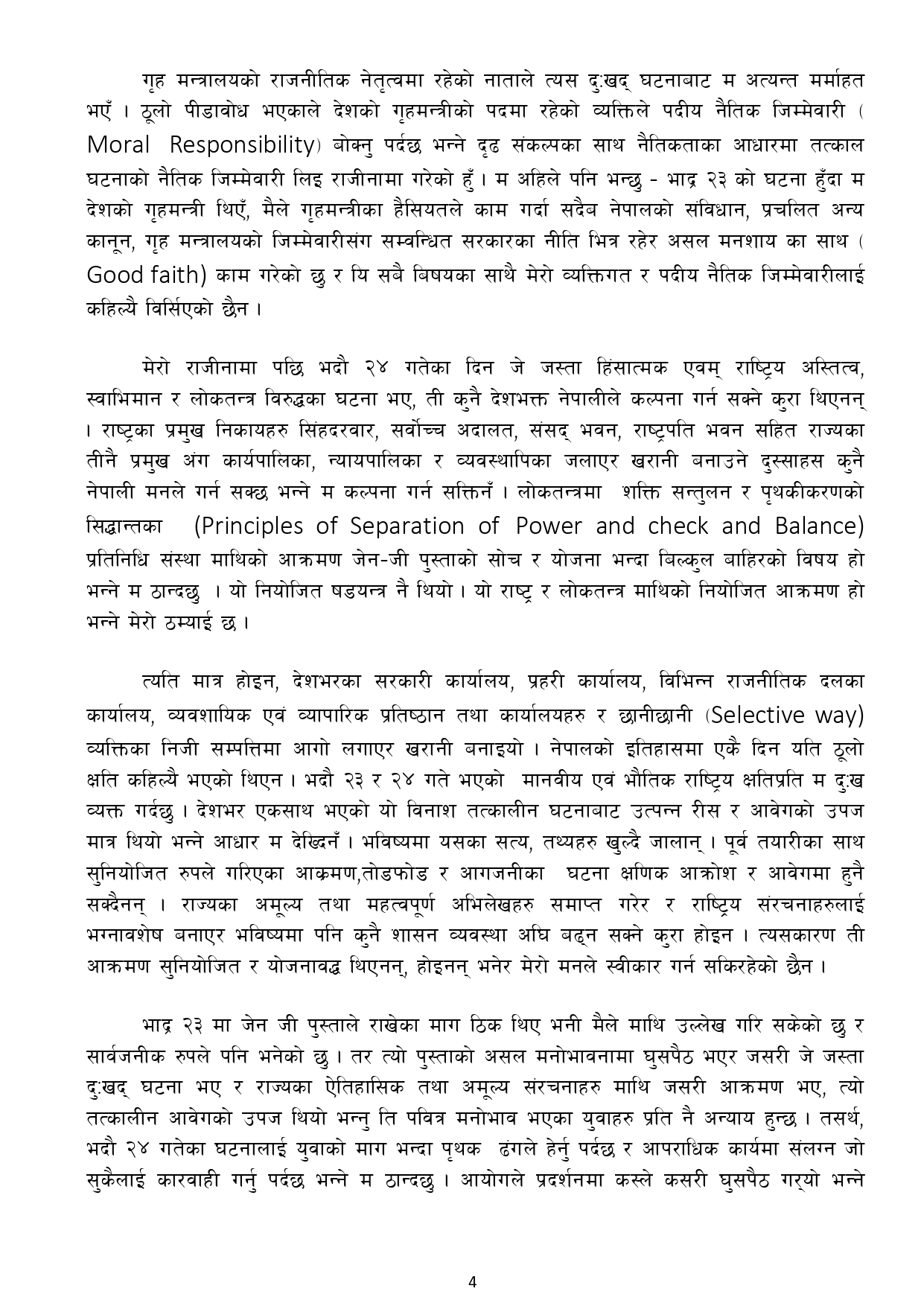 ‘सुरक्षा निकायलाई मैले गृहमन्त्रीको हैसियतले प्रष्ट रुपमा दुई तीन कुरा भनेको थिएँ- पहिलो, कुनै हताहति (क्याजल्टी) नहोस्, कुनै व्यक्तिको मृत्यु हुने अवस्था नआओस् । यसबारेमा सचेत रहनु होला, सावधानी अपनाउनु होला । दोस्रो- समन्वयात्मक रुपमा शान्ति सुरक्षाको उचित प्रवन्ध मिलाउनु होला । तेस्रो- यो कुनै राजनीतिक समूहको प्रदर्शन नभएकाले नेतृत्व विहीन हुन सक्छ । प्रदर्शनमा घुसपैठ पनि हुन सक्छ, शतर्कता अपनाउनु होला । मैले बैठकमा दिएको निर्देशनको सार यति मात्रै हो ।’